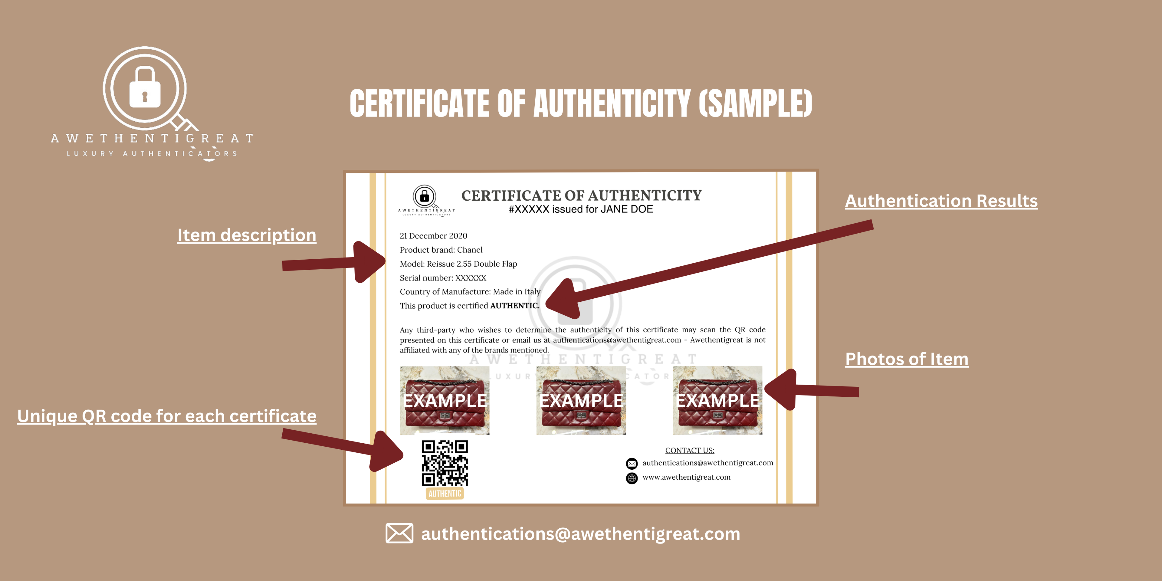 Beware of fake certificates of authenticity with the Awethentigreat brand. Verify the legitimacy of your certificate through the QR code on the certificate or contact us directly if you suspect...